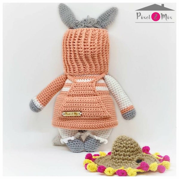 Donatella is a Handmade crocheted toy with Durable Cosy Fine yarn (crochet hook 4 and 4.5). Donatella is approx. 32 cm high including straw hat / ears, without hat approx. 26 cm.