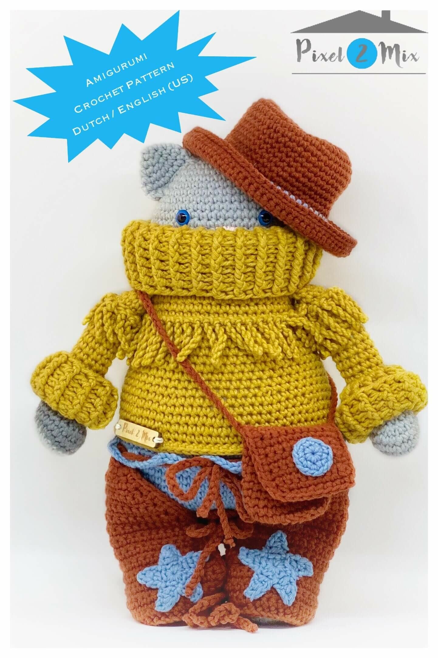 The pattern clearly explains how to do a certain stitch using drawings and YouTube links. The collar is crocheted directly to the body. Harry has various accessories, such as a hat, boots, chaps and a bag, so that you can conjure up another stuffed toy.